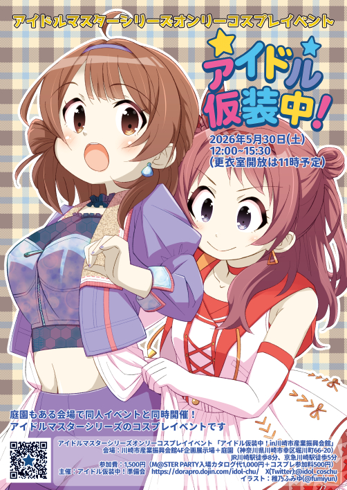 | イベント内容 | アイドルマスターシリーズオンリーコスプレイベント | 日時 | 2026年5月30日(土) 12:00~15:30 (更衣室解放は11時予定) |